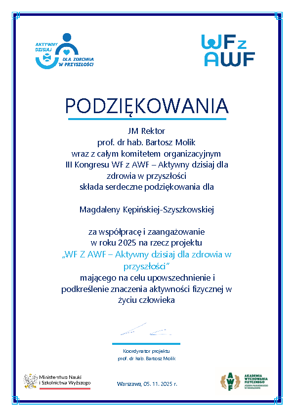 Pani dr Magdalena Kępińska-Szyszkowska brała udział w projekcie "WF z AWF - Aktywny Dzisiaj dla Zdrowia w Przyszłości" edycja V 2025, realizowanego przez Akademię Wychowania Fizycznego w Warszawie we współpracy z Ministerstwem Nauki i Szkolnictwa Wyższego i innymi uczelniami. W ramach projektu powołano Zespół ds. Diagnozy i Badań Kondycji Fizycznej Przedszkolaków, którego celem była ocena postawy ciała dzieci w wieku 4-6 lat.