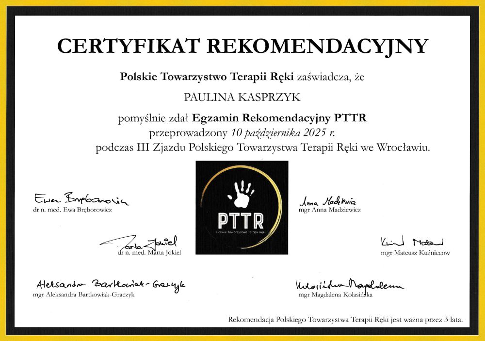 W dniu 10.10.2025 podczas III Zjazdu Polskiego Towarzystwa Terapii Ręki we Wrocławiu odbył się pierwszy w Polsce Egzamin Rekomendacyjny Polskiego Towarzystwa Terapii Ręki. W egzaminie wzięła udział pracownica Instytutu Nauk Stosowanych, zatrudniona w Zakładzie Terapii Zajęciowej Stosowanej Pani mgr Paulina Kasprzyk, która pomyślnie zdała Egzamin Rekomendacyjny i uzyskała akredytację PTTR jako pierwszy terapeuta zajęciowy w Polsce.