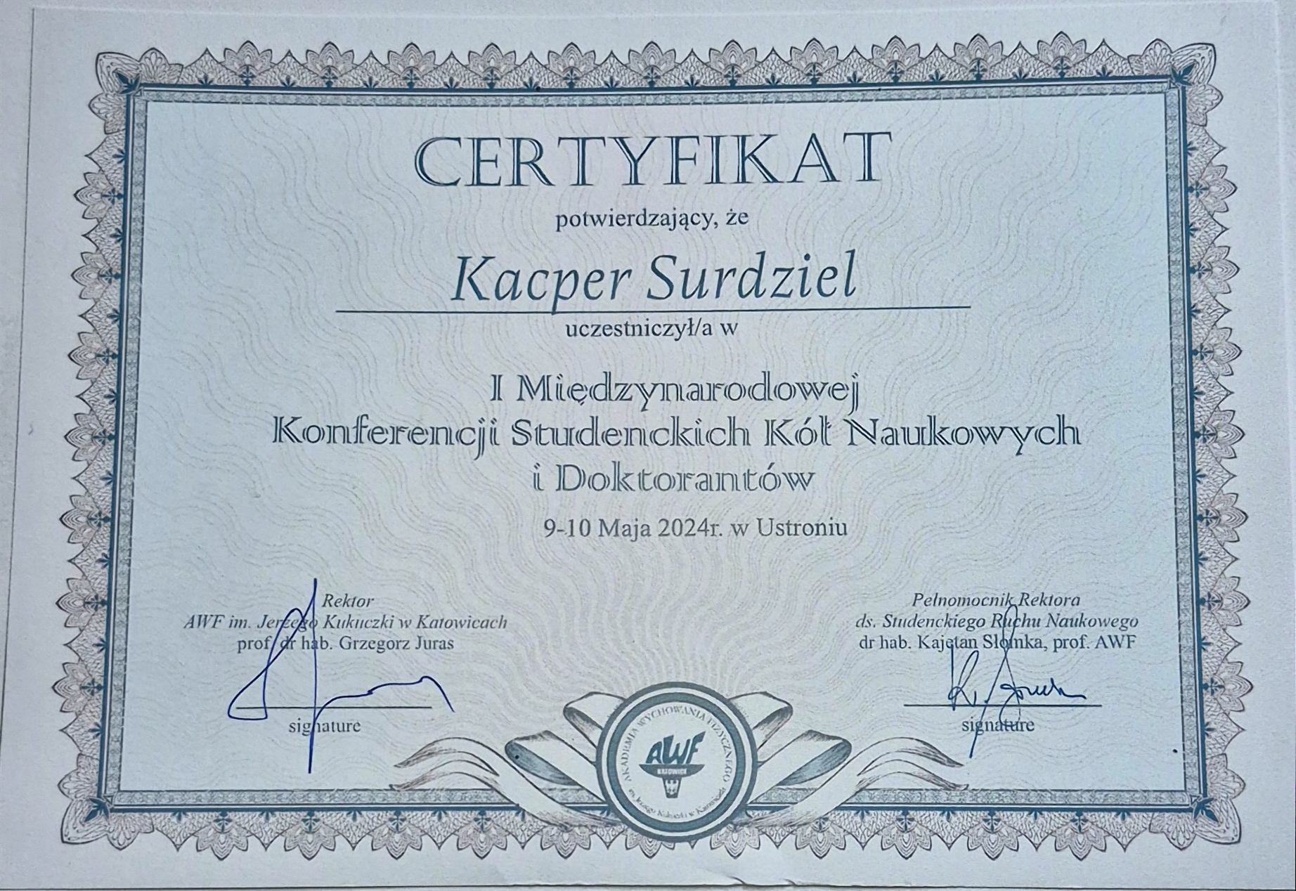 2.Konferencja Studenckich Kół Naukowych i Doktorantów Akademii Wychowania Fizycznego w Katowicach (Brenna 2025, 15-16 maj), na której wygłoszono prezentację przez: