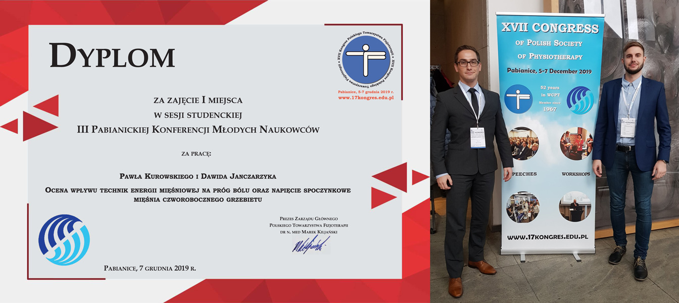 W dniach 6-7 grudnia 2019 roku w Pabianicach, odbywał się 17 kongres Polskiego Towarzystwa Fizjoterapii. Jego częścią już po raz trzeci była Konferencja Młodych Naukowców, na której Akademię Wychowania Fizycznego w Krakowie oraz koło naukowe "Szansa" reprezentowali studenci fizjoterapii: Dawid Janczarzyk i Paweł Kurowski pod opieką naukową Profesora Marka Pieniążka. Jako współautorzy prezentowali dwie prace, z których jedna "Ocena wpływu energii mięśniowej na próg bólu oraz napięcie spoczynkowe mięśnia czworobocznego grzbietu" zajęła pierwsze miejsce spośród 24 prezentowanych prac.