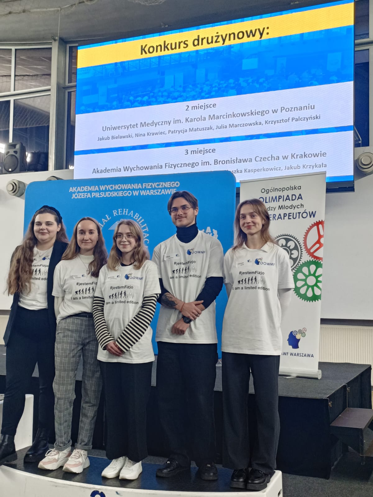 W dniu 16 listopada 2024 dziesięciu studentów kierunku Fizjoterapia ze Studenckich Kół Naukowych: „Szansa”, „Rocker”, „Triada” oraz "Trauma Medical Group" reprezentowało naszą uczelnie na IX Ogólnopolskiej Olimpiadzie Wiedzy Młodych Fizjoterapeutów organizowanej przez AWF w Warszawie. W konkursie drużynowym nasi reprezentanci w składzie: Agnieszka Kasperkowicz, Jakub Krzykała, Patrycja Bielak, Joanna Lichańska, Aleksandra Kozub zajęli 3 miejsce. Natomiast w konkursie indywidualnym, w kategorii studenci 4 i 5 roku Patrycja Bielak uplasowała się na wysokim 5 miejscu.