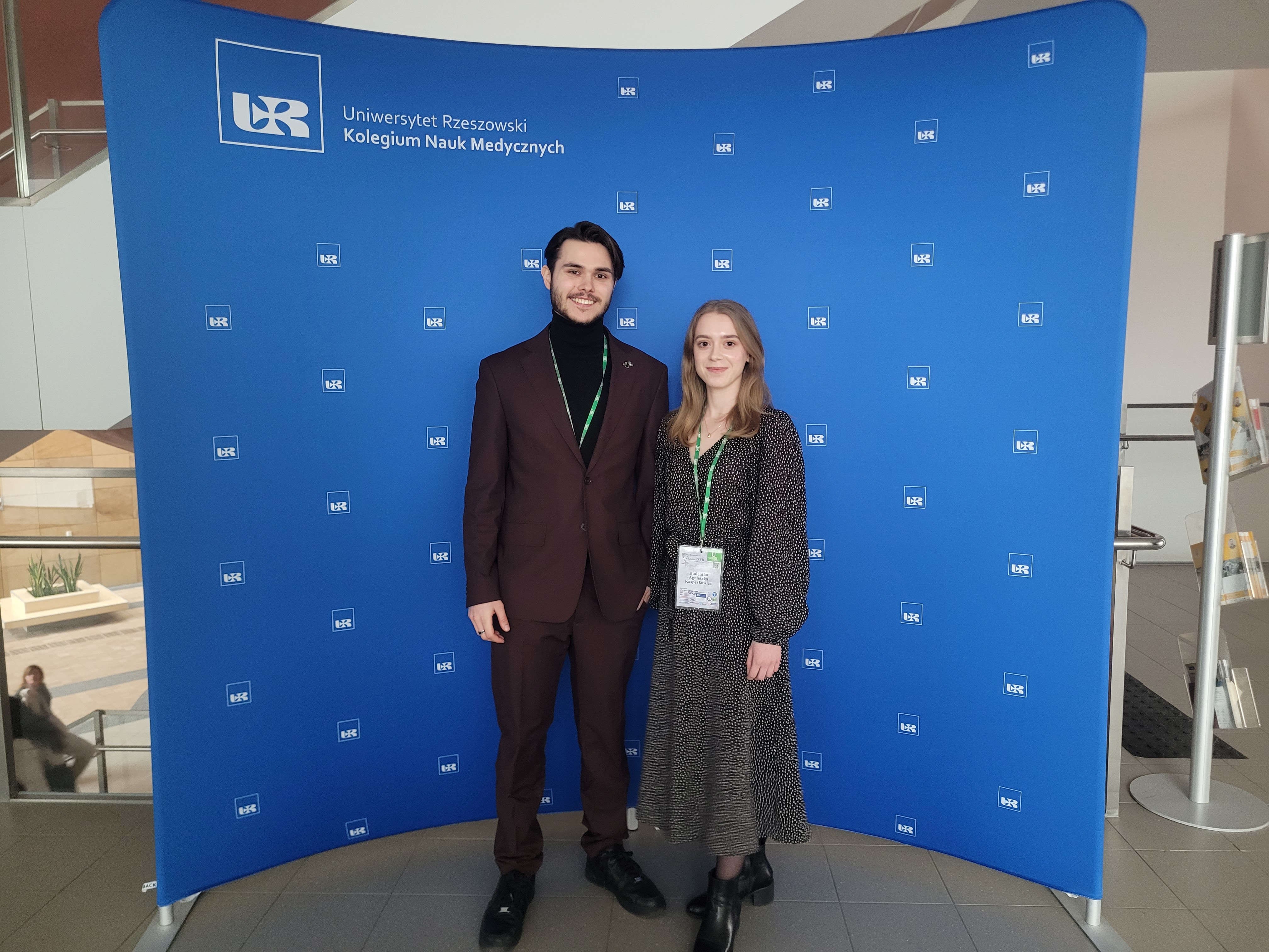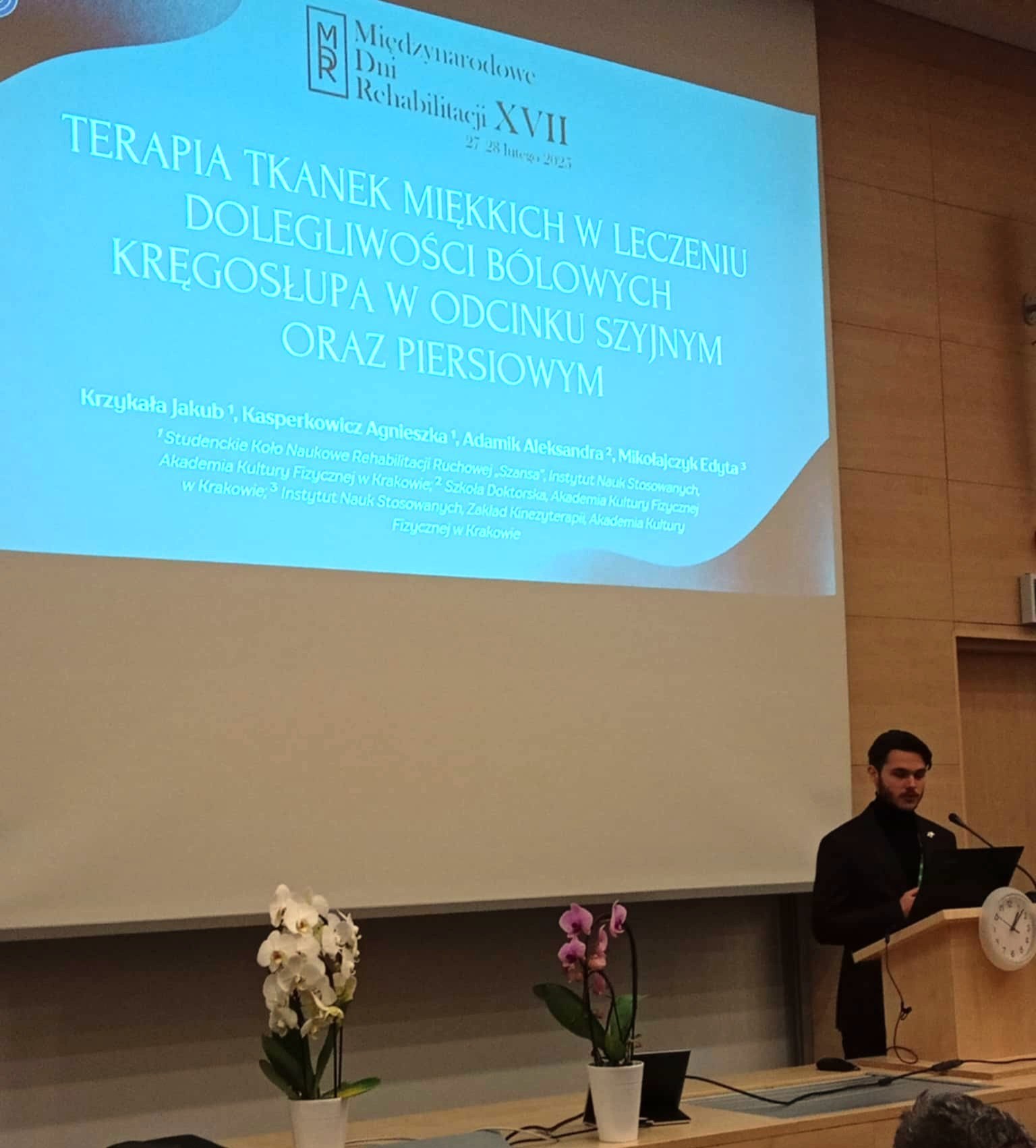 W dniach 27-28.02.2025 podczas XVII Międzynarodowych Dni Rehabilitacji w Uniwersytecie Rzeszowskim, studenci reprezentujący Koło Naukowe Rehabilitacji Ruchowej „Szansa”: Jakub Krzykała i Agnieszka Kasperkowicz oraz Studenckie Koło Naukowe In-Out: Małgorzata Bodziany i Jakub Korzeniowski, przedstawili wyniki badań realizowanych projektów:
